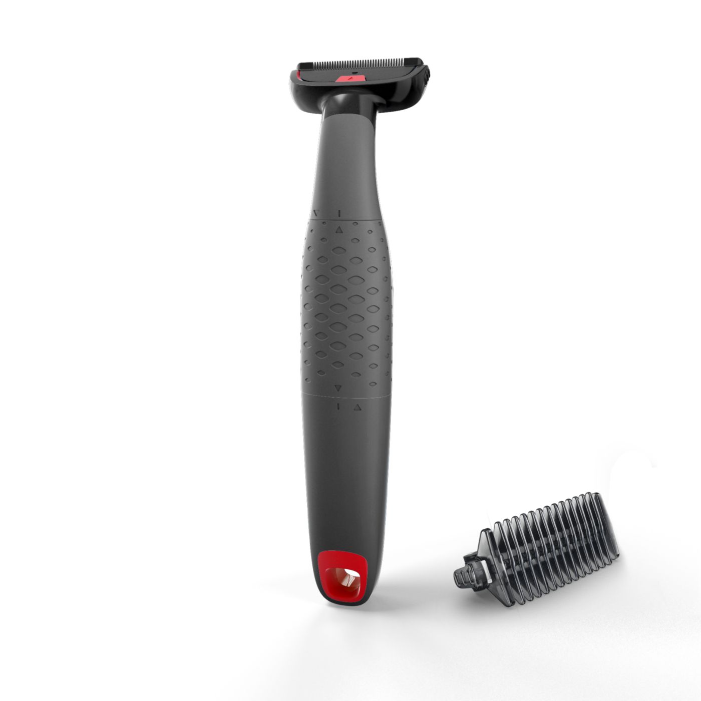 Corte os pelos que crescem em qualquer direção usando o aparador bidirecional e o pente de 3 mm. Para pelos mais grossos, recomenda-se apara-los previamente.