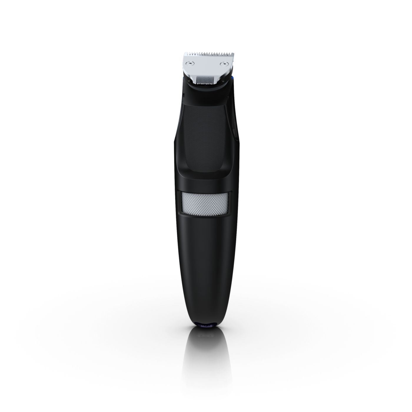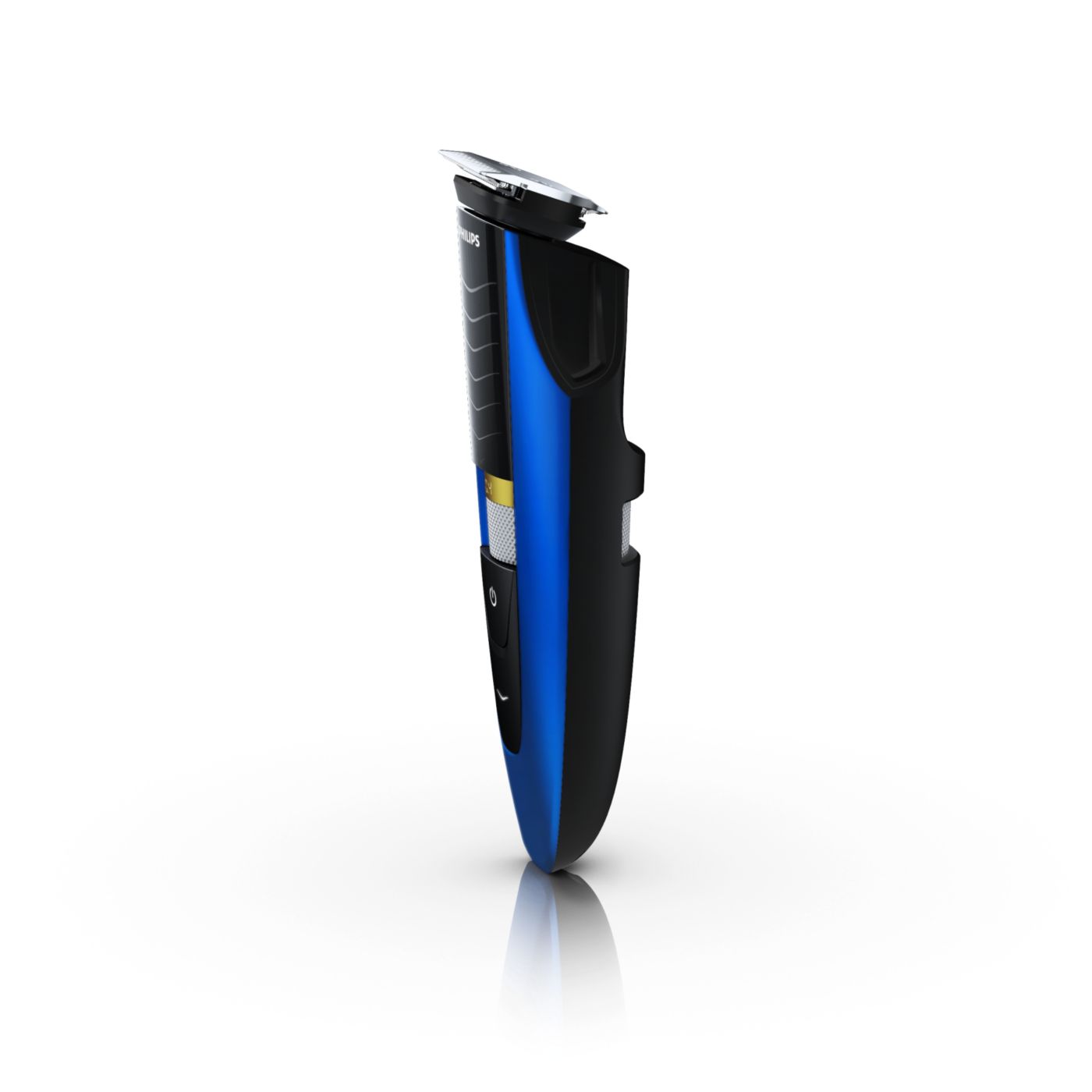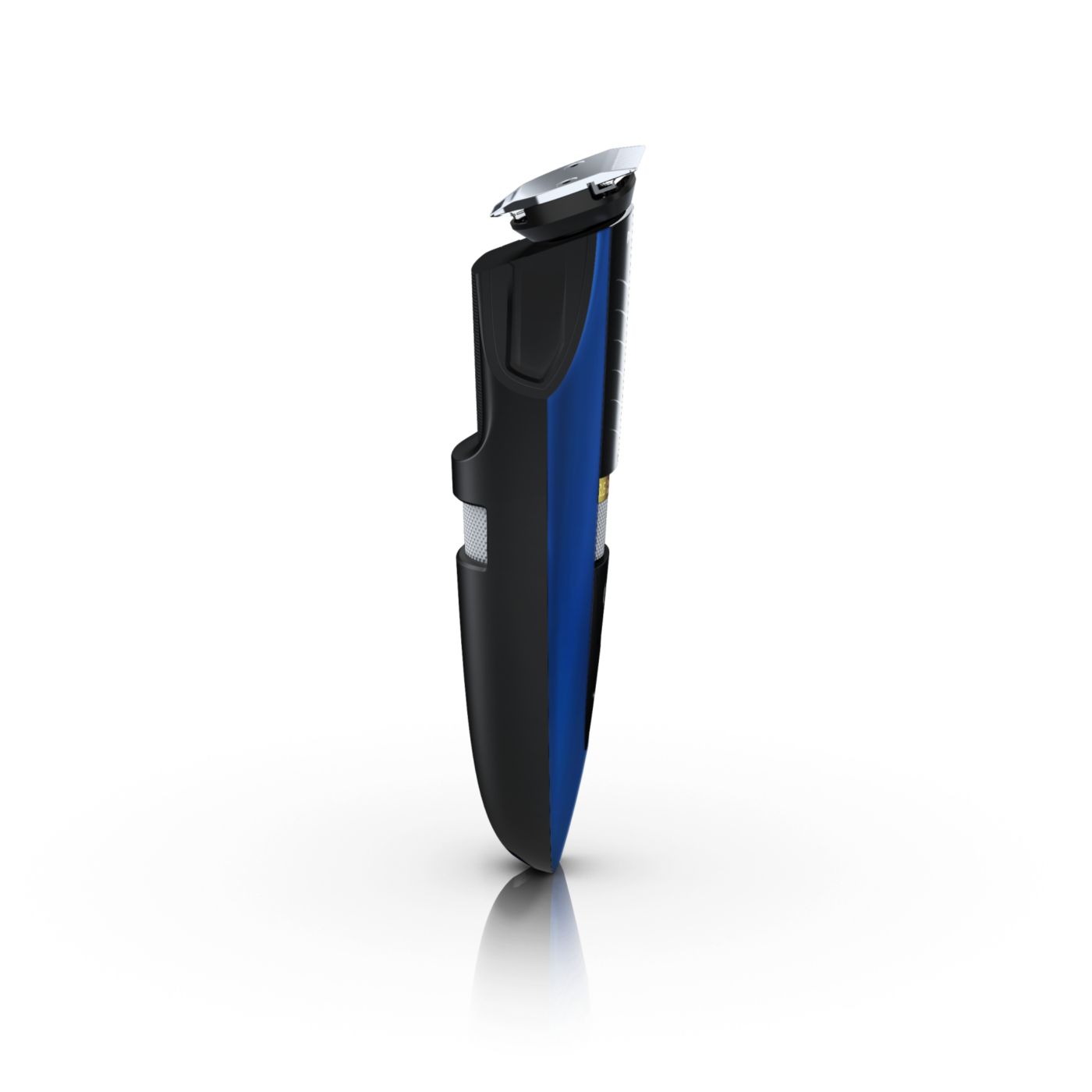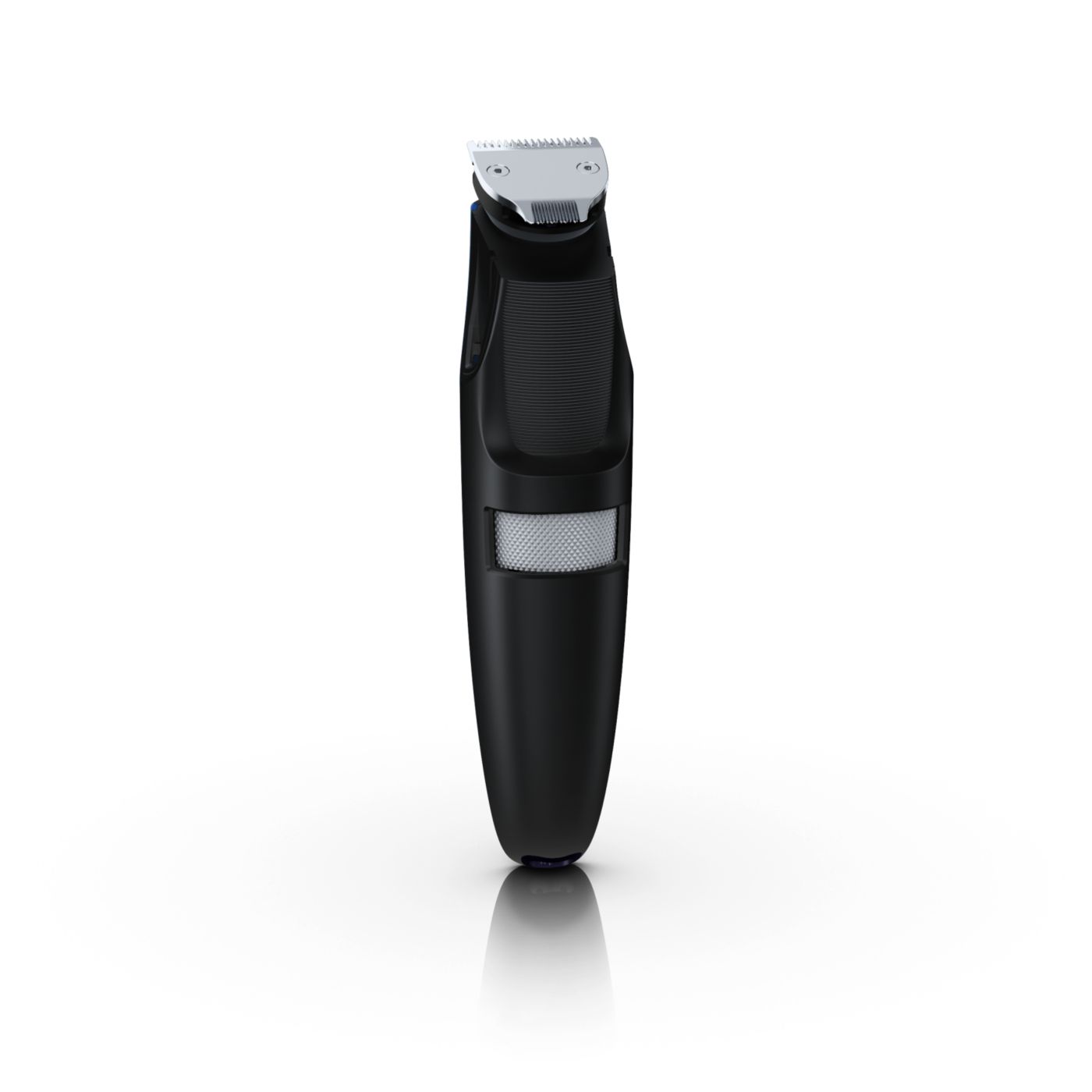 Retire o pente ajustável e você verá um aparador de precisão reversível duplo. De um lado, há o aparador de alto desempenho de 32 mm. Gire-o e verá um aparador de precisão de 15 mm, perfeito para pequenos espaços, como sob o nariz ou em volta da boca. Desenvolvido para cortar muito rente e ainda proteger sua pele; o tamanho compacto e o design com ângulos facilitam a visão para que você obtenha linhas e detalhes finos.