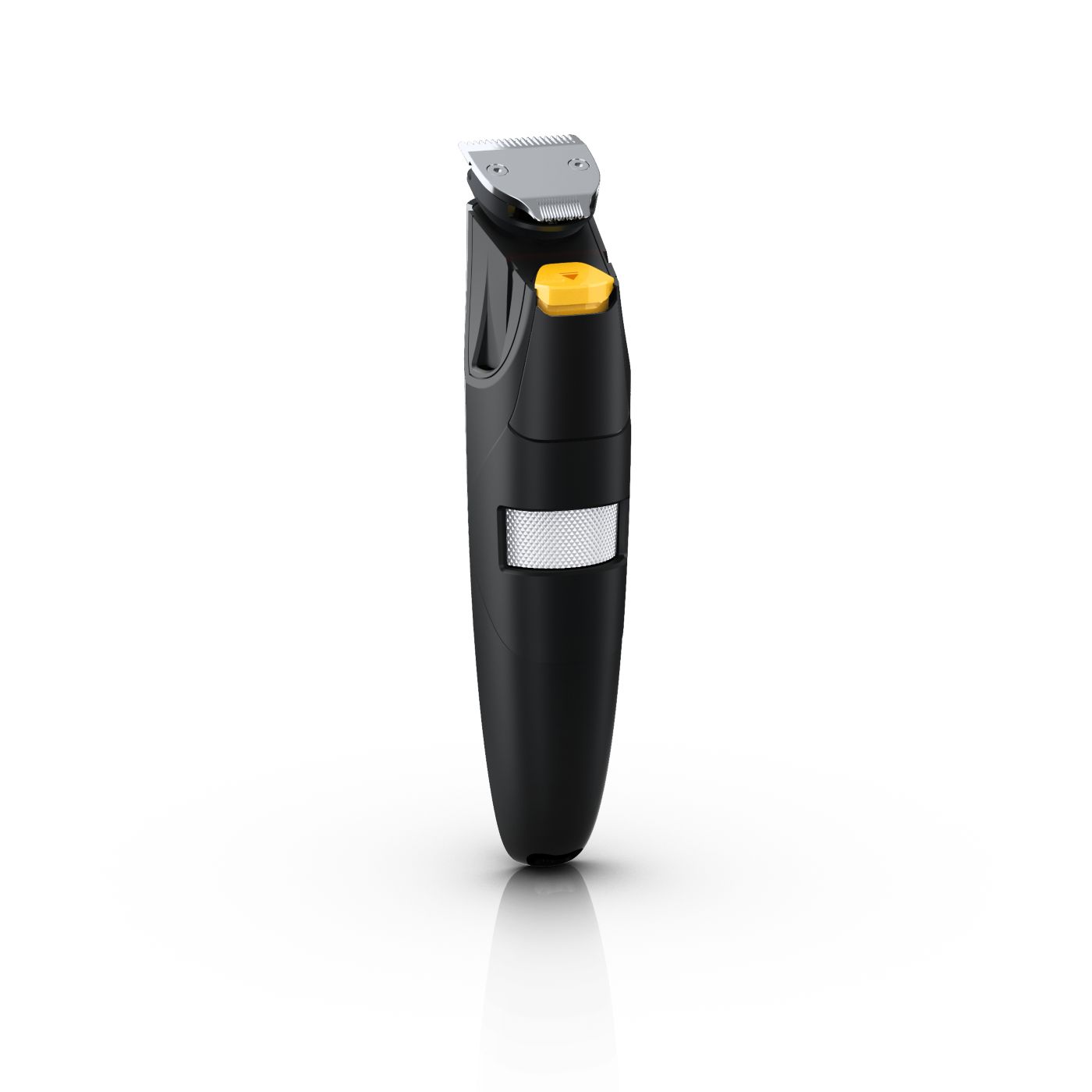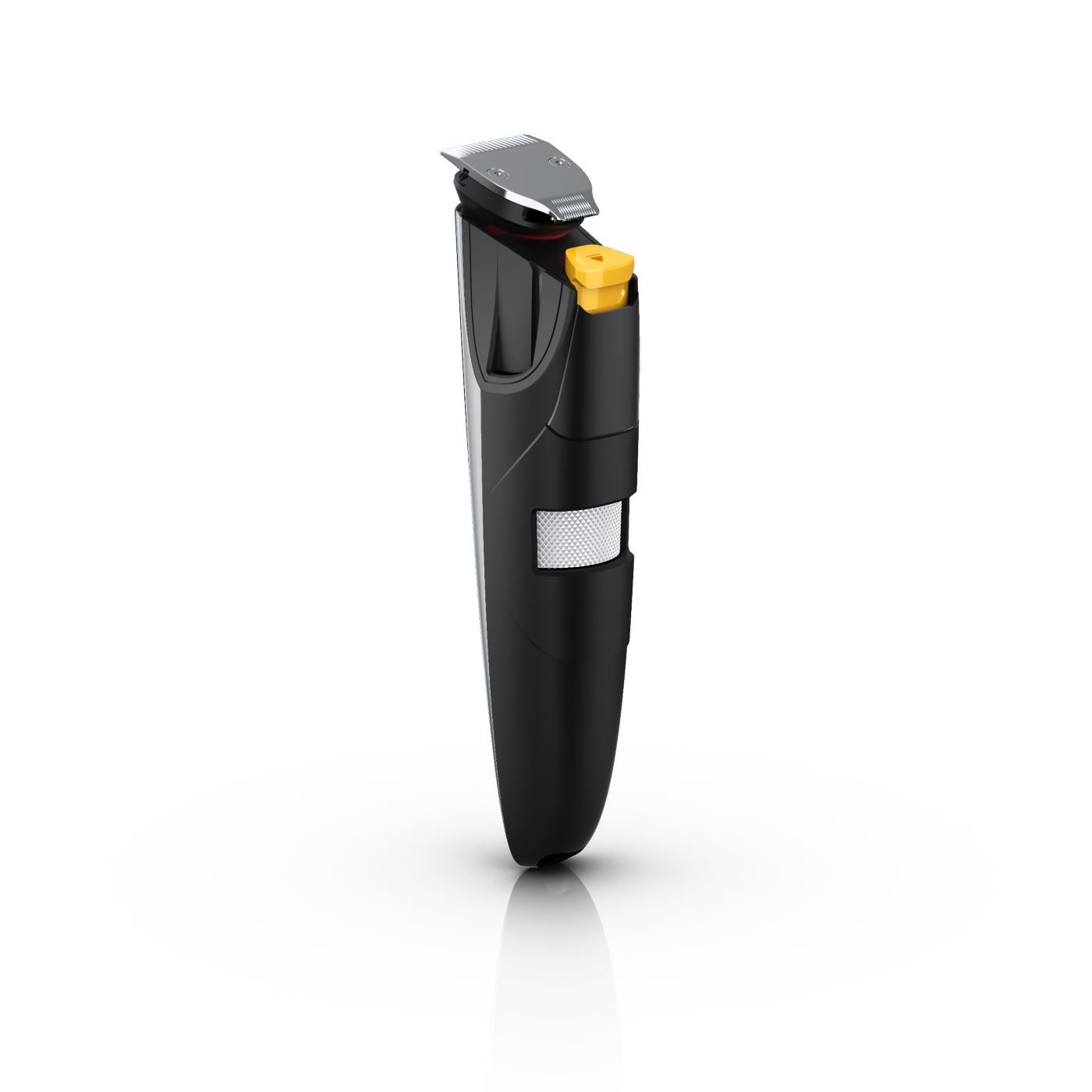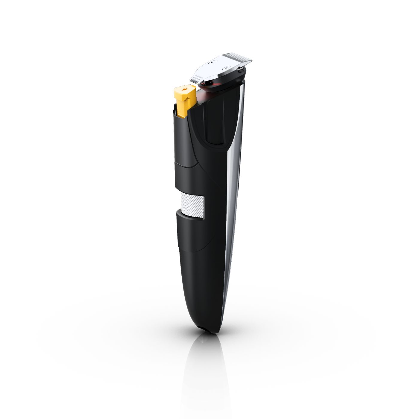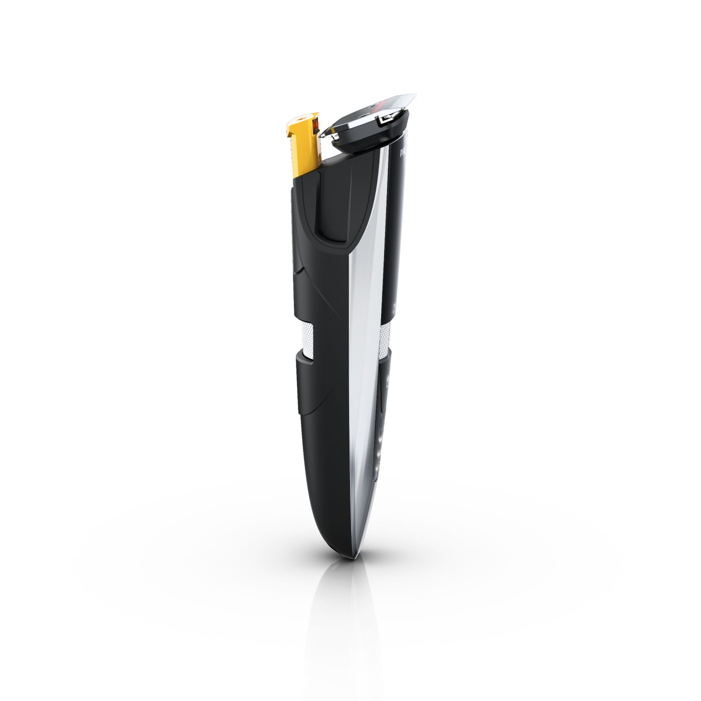 O aparador bilateral reversível oferece versatilidade para você criar seu próprio visual. De um lado, o aparador de alto desempenho de 32mm (1 17/64 pol) corta bem rente, além de proteger sua pele. Do outro lado, o aparador de precisão de 15mm (5/8 pol) cria um visual cheio de detalhes, mesmo em áreas difíceis de alcançar, como debaixo do nariz e em volta da boca. O tamanho compacto e o design angular do aparador facilitam a visão para que você obtenha linhas e detalhes finos e precisos.