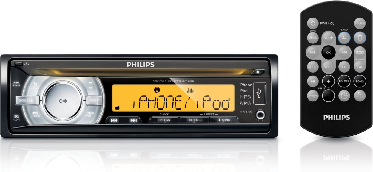 Curta músicas armazenadas em um iPhone/iPod, CD ou dispositivo USB/cartão SDHC a todo volume com o som sutomotivo Philips. Cuide bem de seus ouvidos com graves potentes e a tecnologia MAX Sound e dê prazer aos seus olhos por meio das cores do display LCD e da luz de fundo personalizada.
