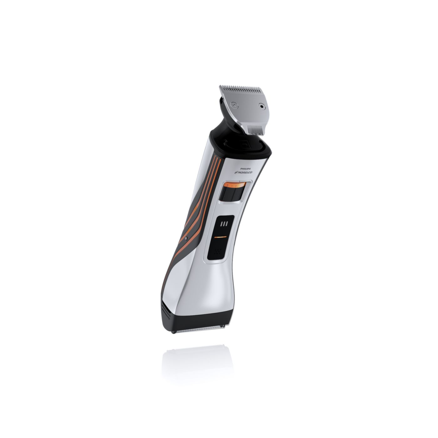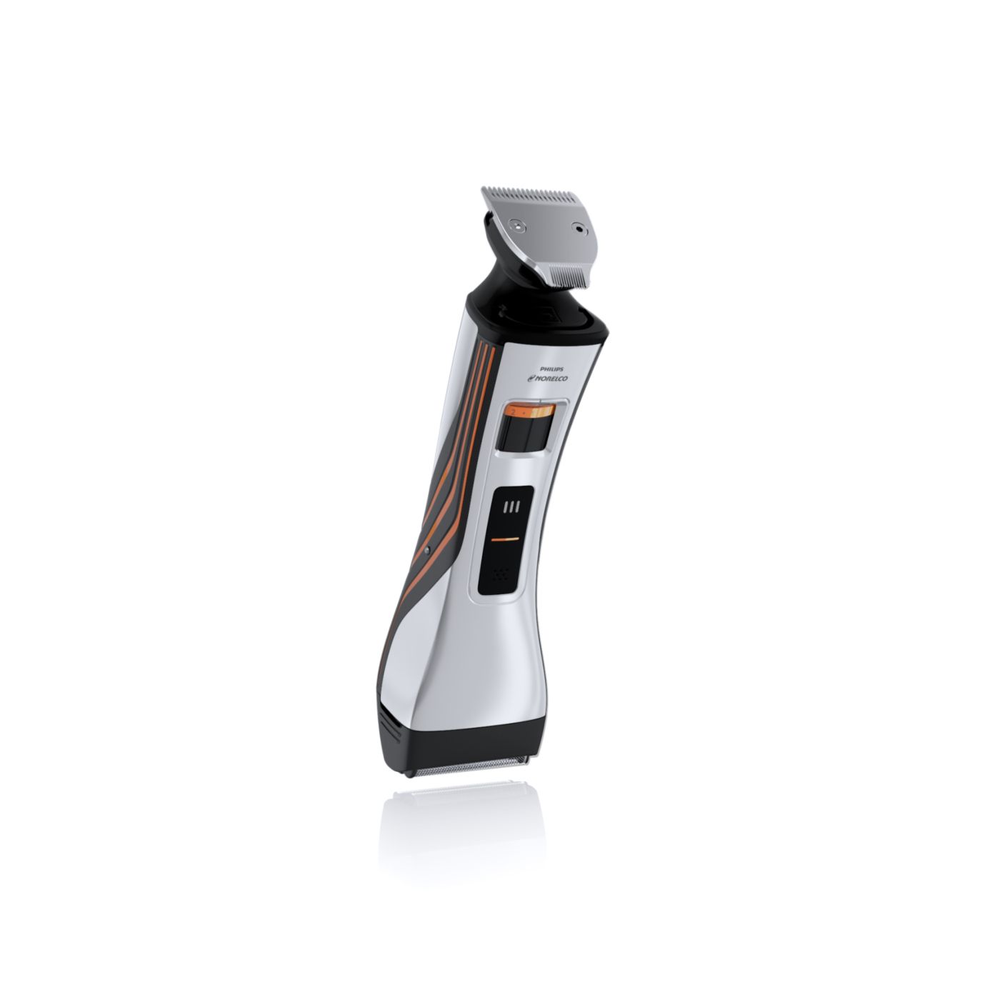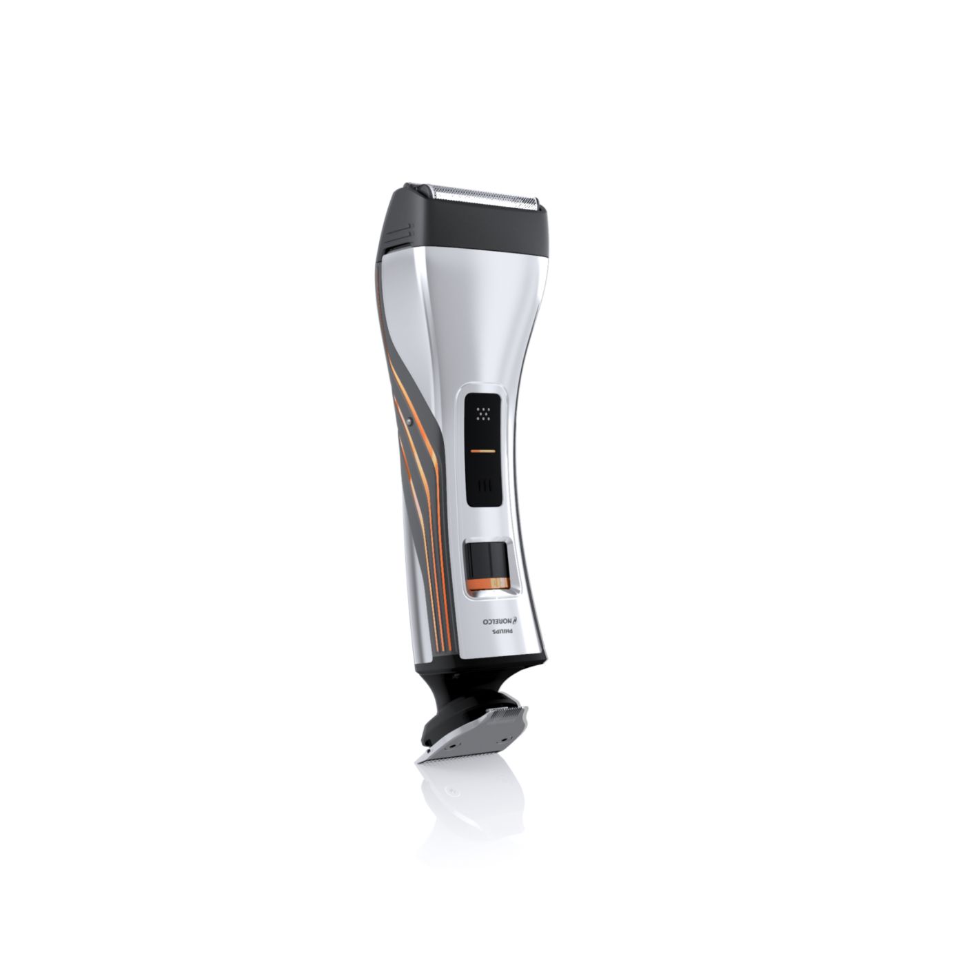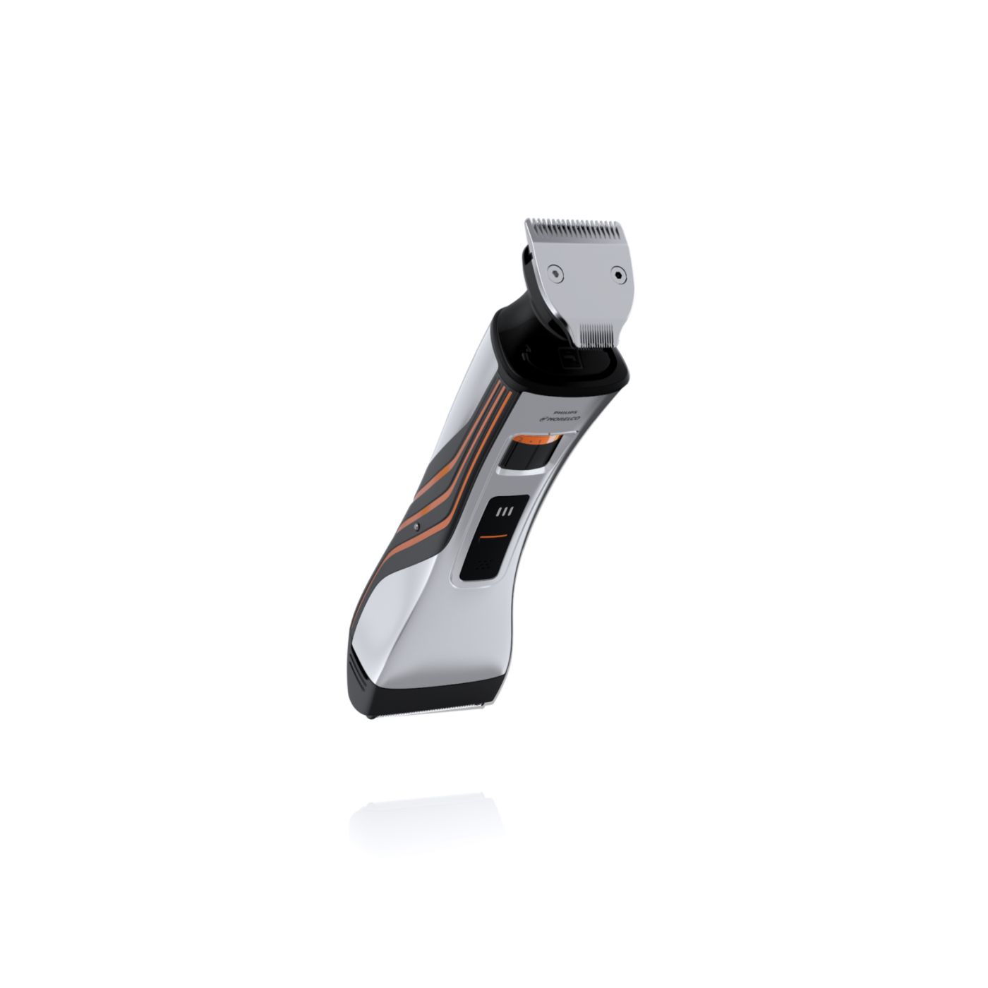 Retire o pente de comprimento ajustável para usá-lo como aparador de precisão reversível duplo. De um lado, há o aparador de alto desempenho de 32mm. Gire-o para usá-lo como aparador de precisão de 15mm, perfeito para áreas pequenas, como sob o nariz ou em volta da boca. Desenvolvido para cortar muito rente e proteger sua pele, o tamanho compacto e o design angular facilitam a visão para que você crie linhas e detalhes finos.