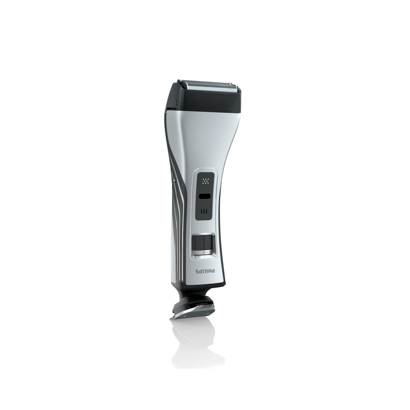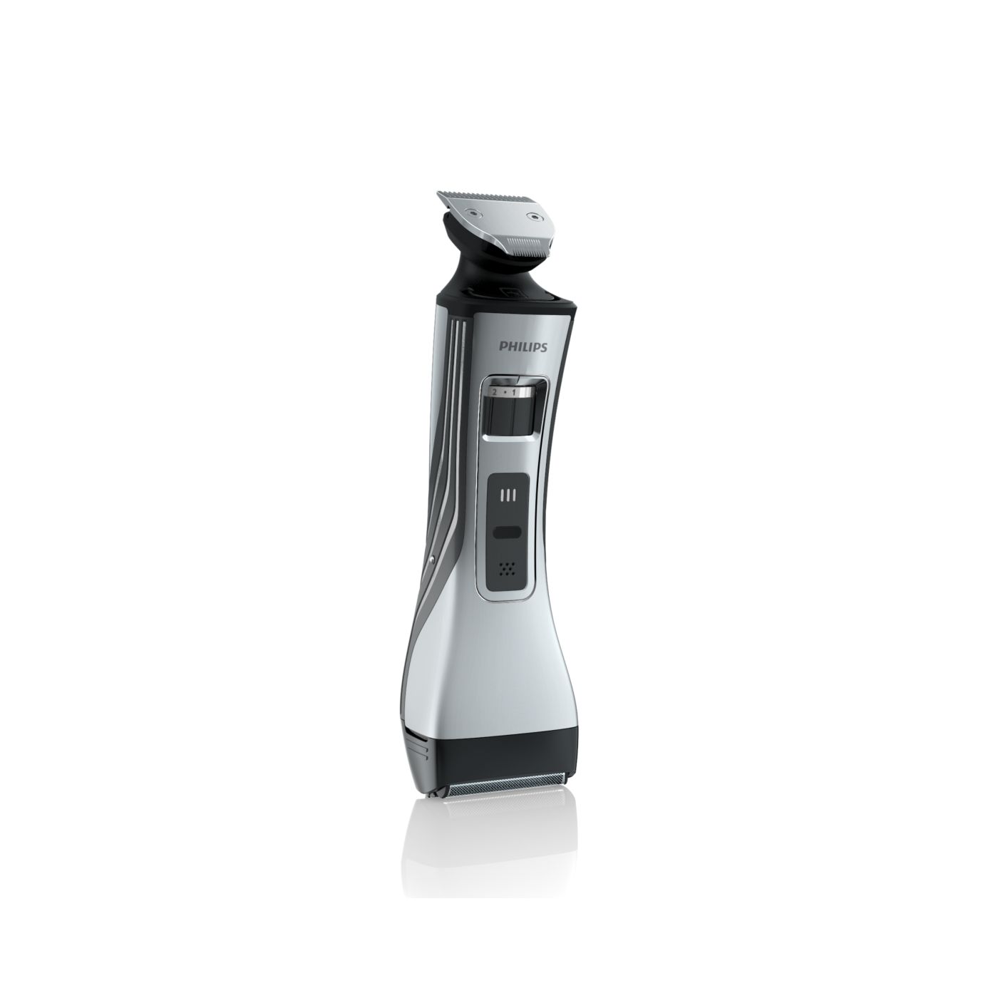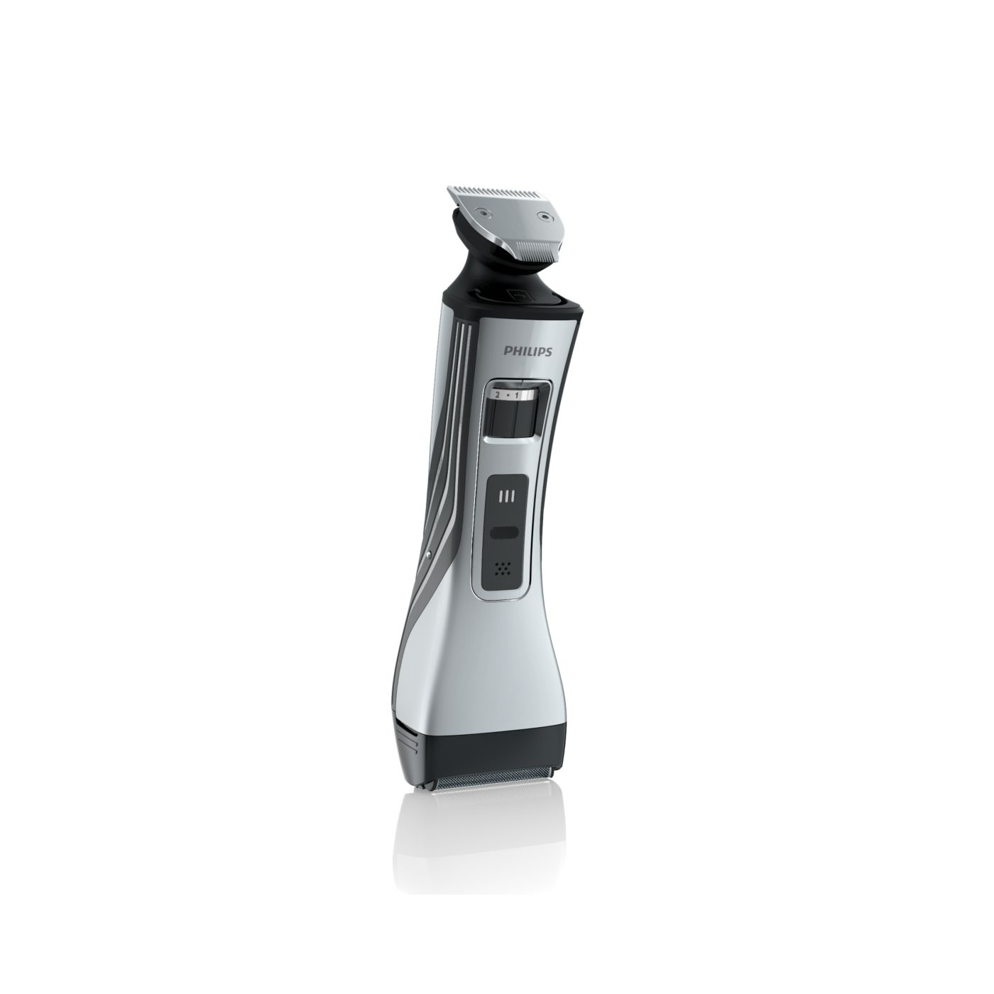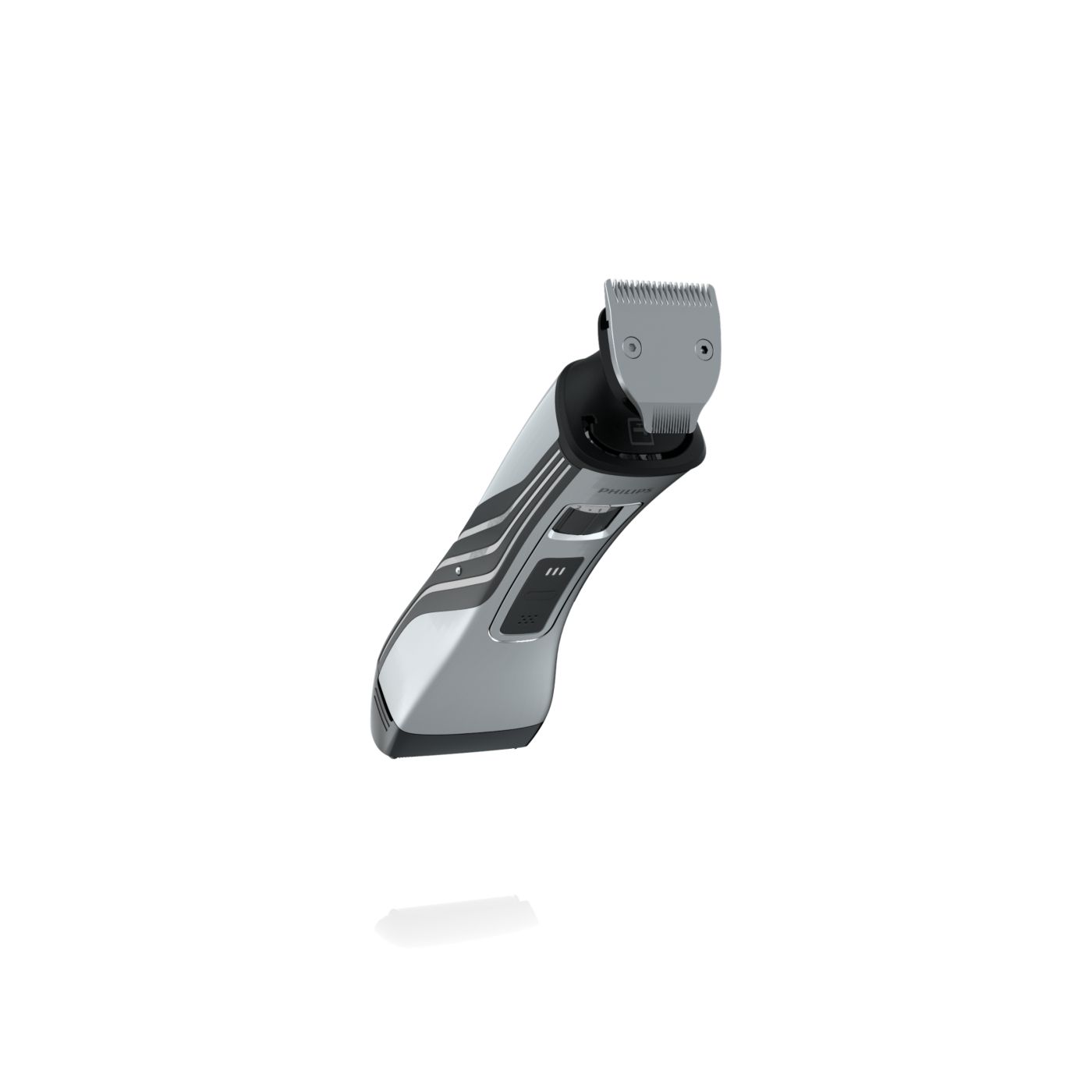 O aparador totalmente metálico (32 mm) e o pente com 12 ajustes de comprimento facilitam o barbear para que você possa obter exatamente o comprimento de barba desejado. Selecione o ajuste mais adequado usando o controle giratório. O aparador de metal resistente com bordas arredondadas garante uma aparagem precisa e uniforme.