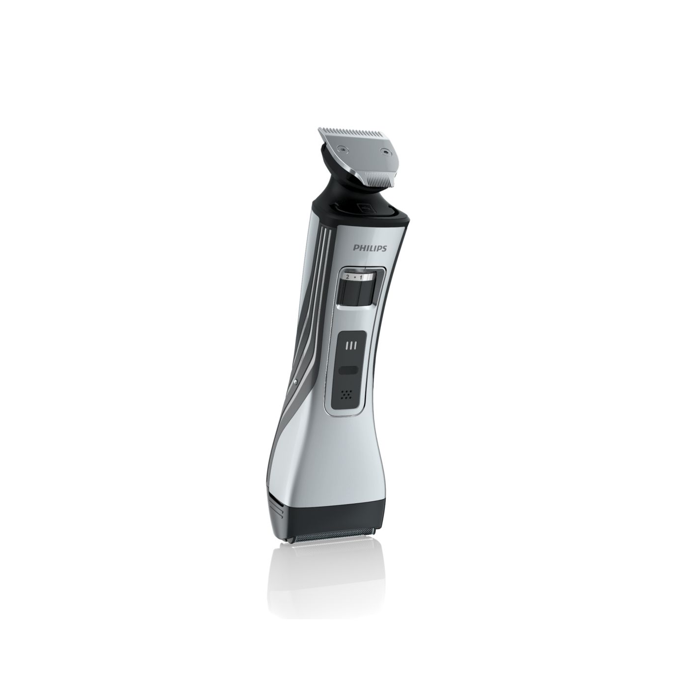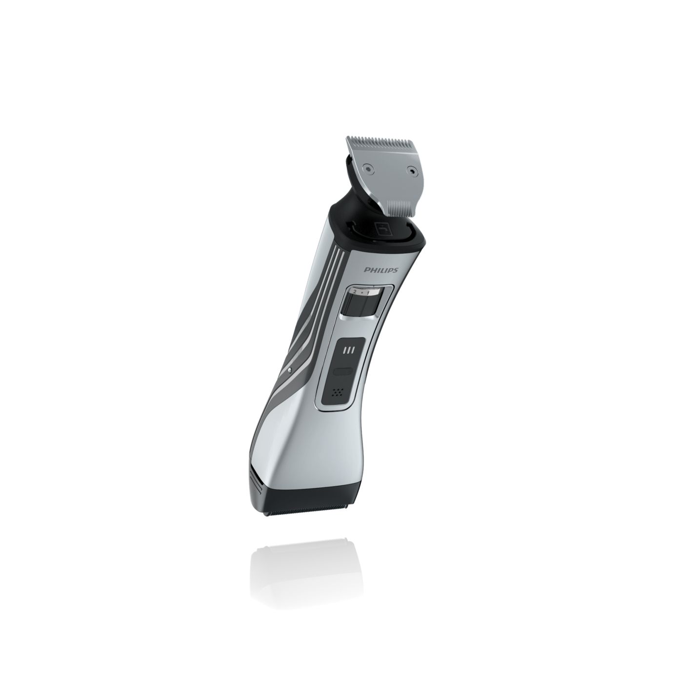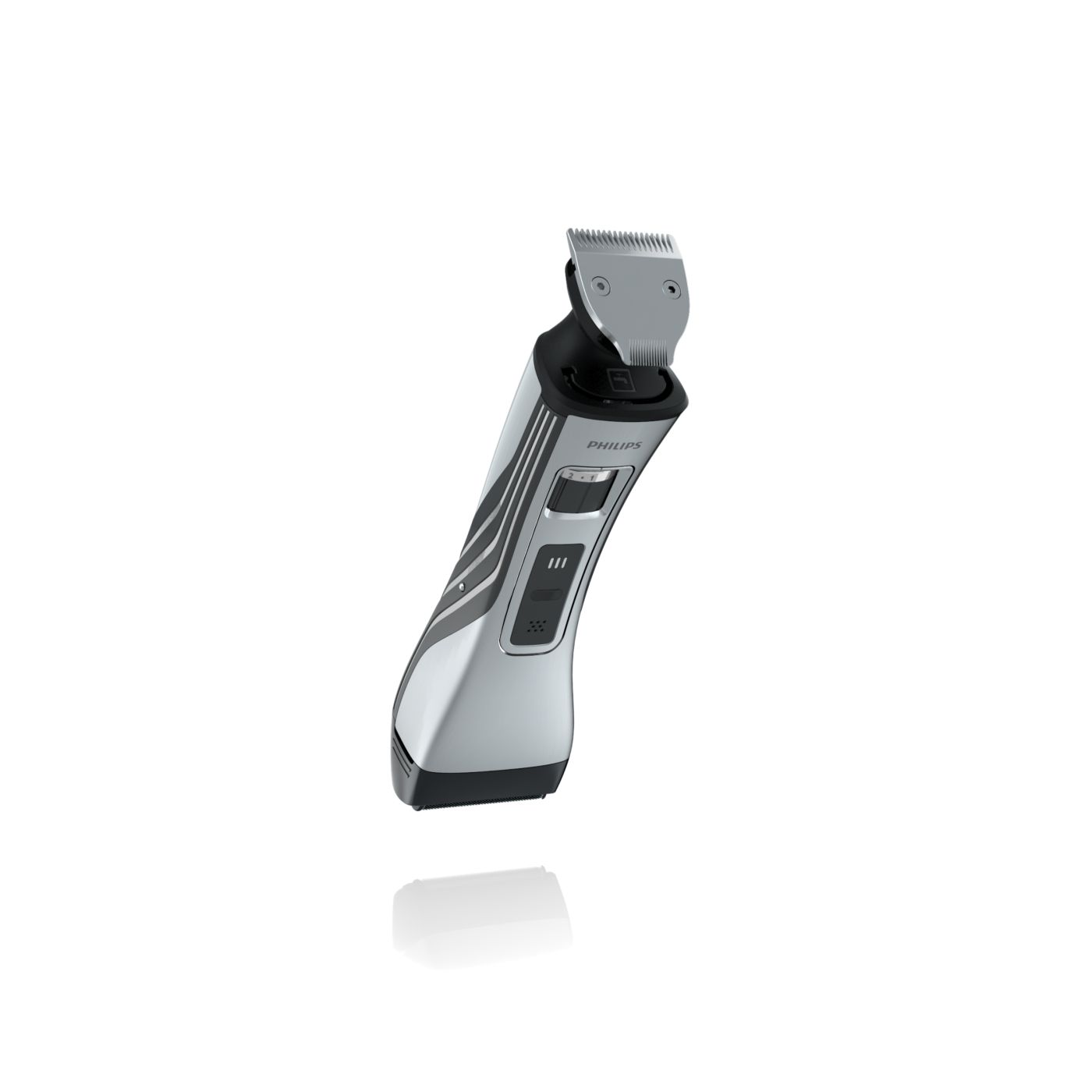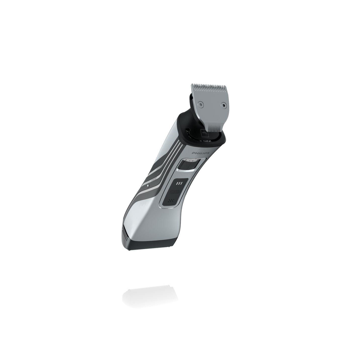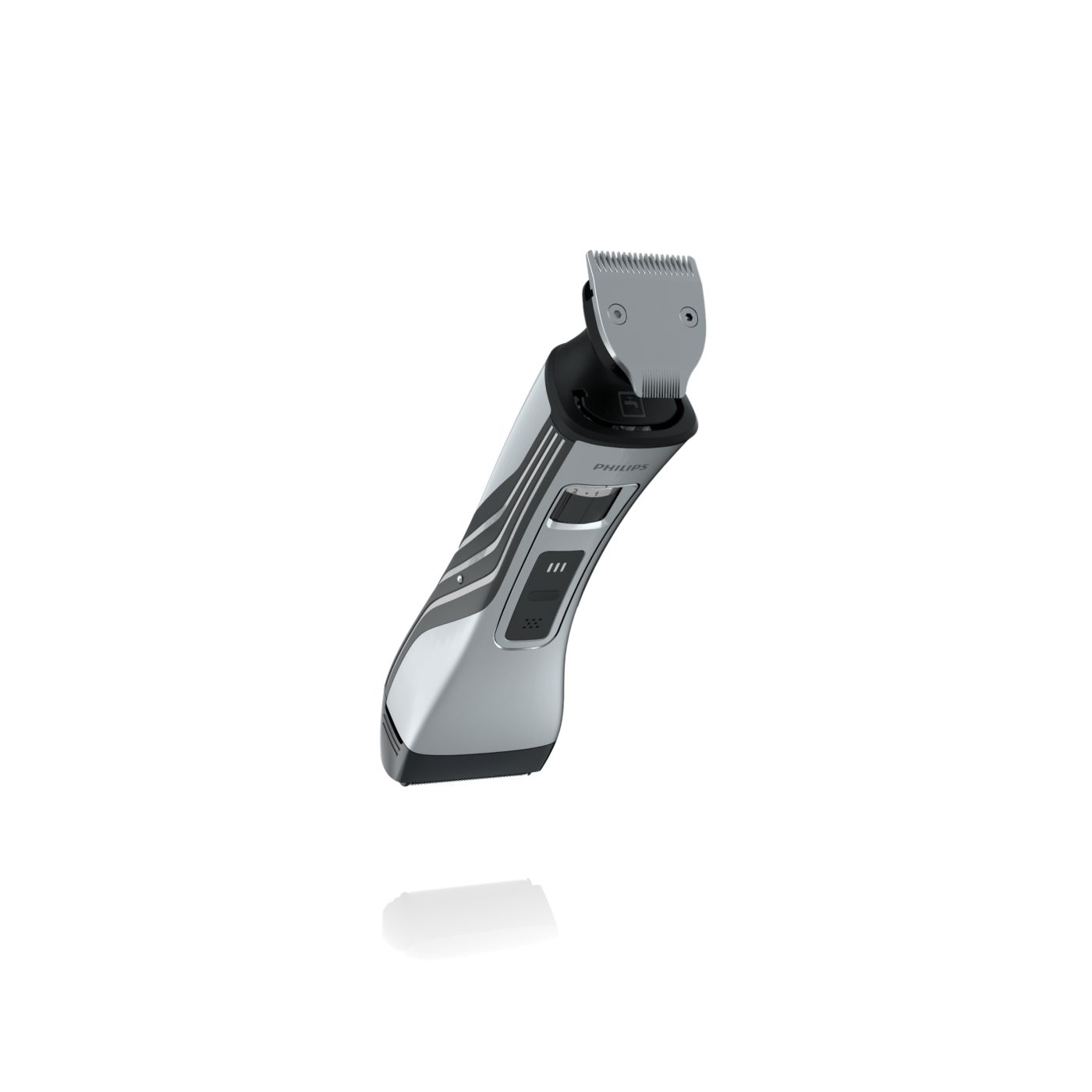 O aparador totalmente metálico (32 mm) e o pente com 12 ajustes de comprimento facilitam o barbear para que você possa obter exatamente o comprimento de barba desejado. Selecione o ajuste mais adequado usando o controle giratório. O aparador de metal resistente com bordas arredondadas garante uma aparagem precisa e uniforme.