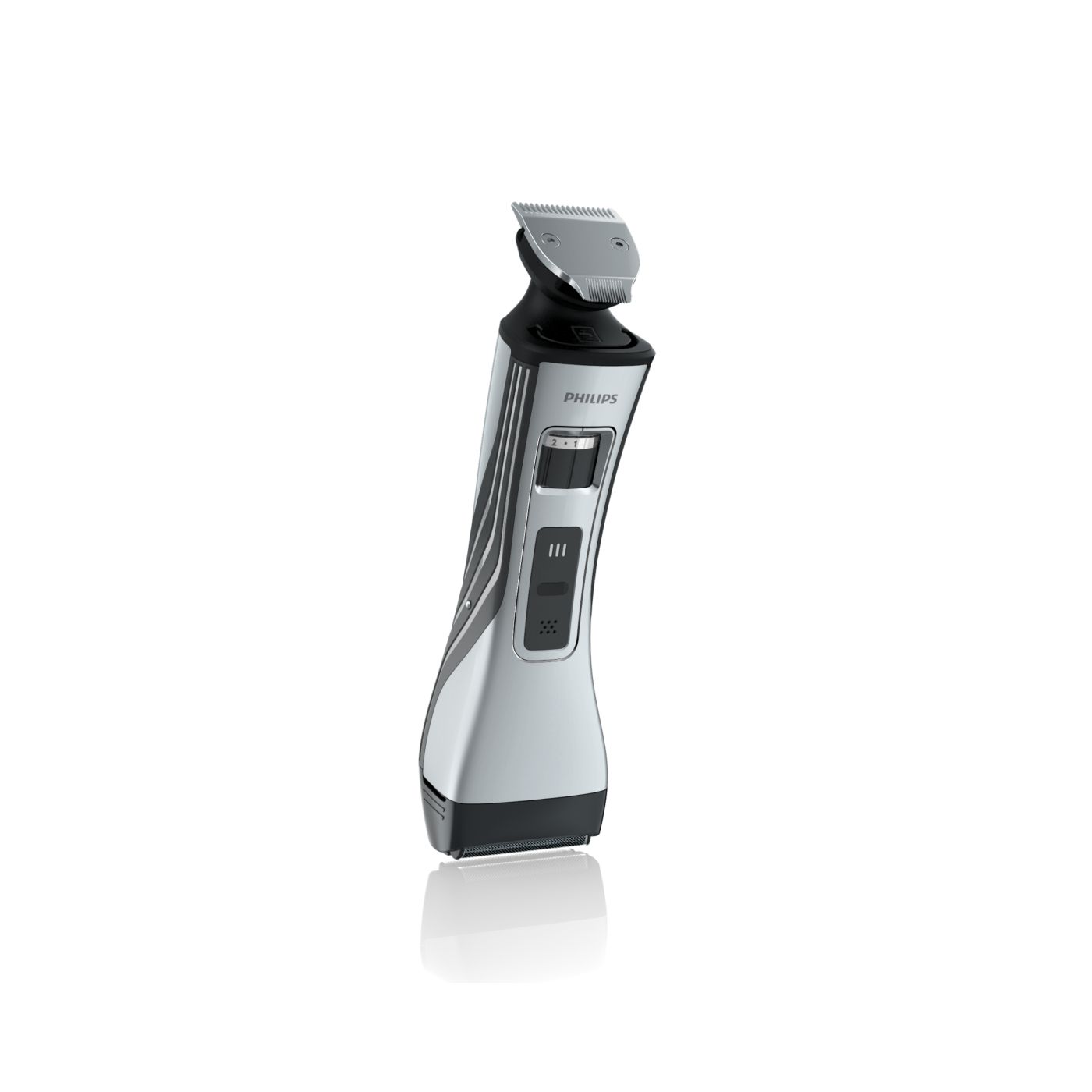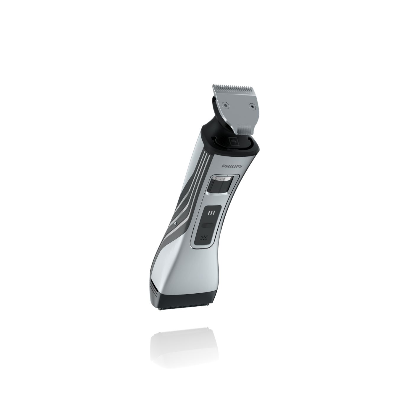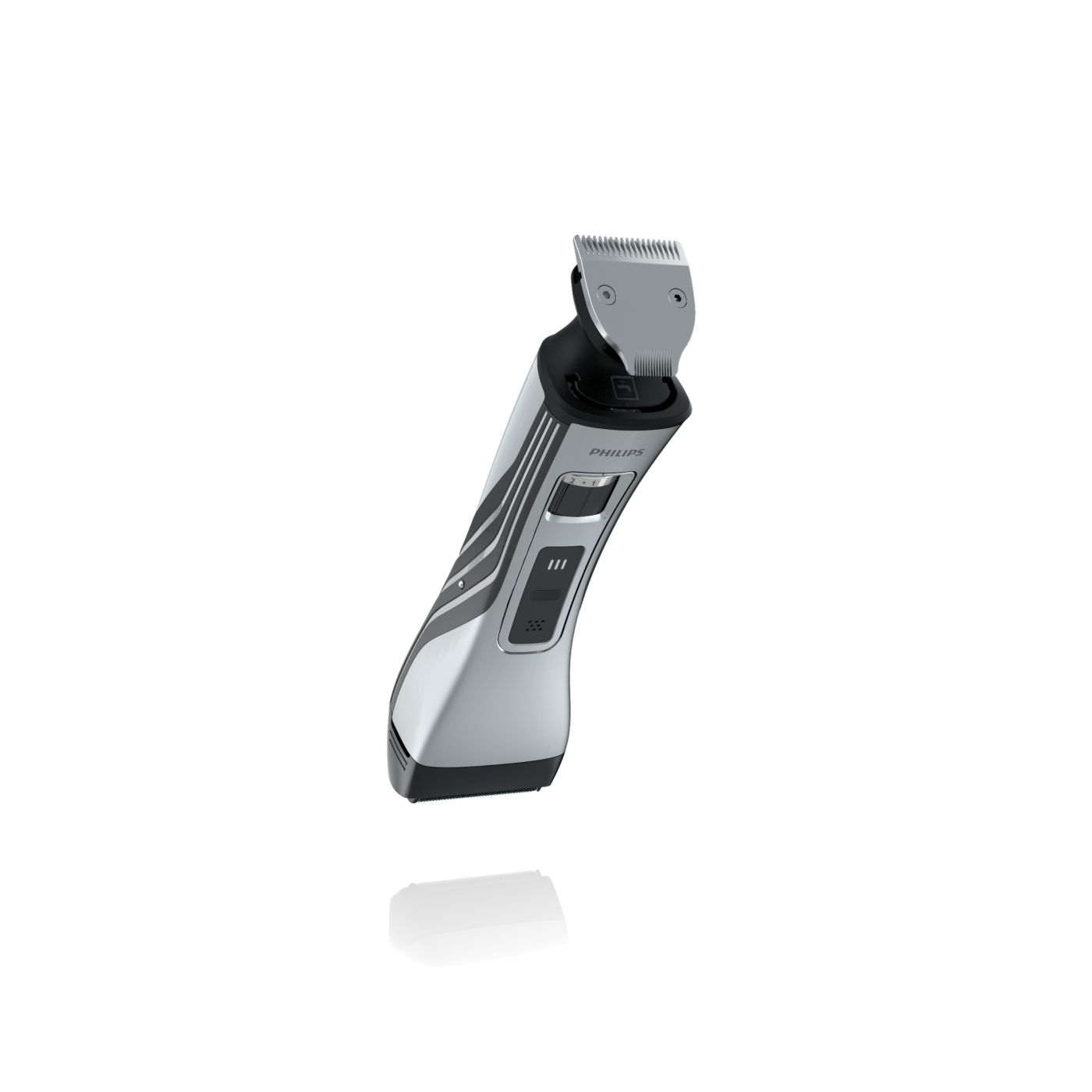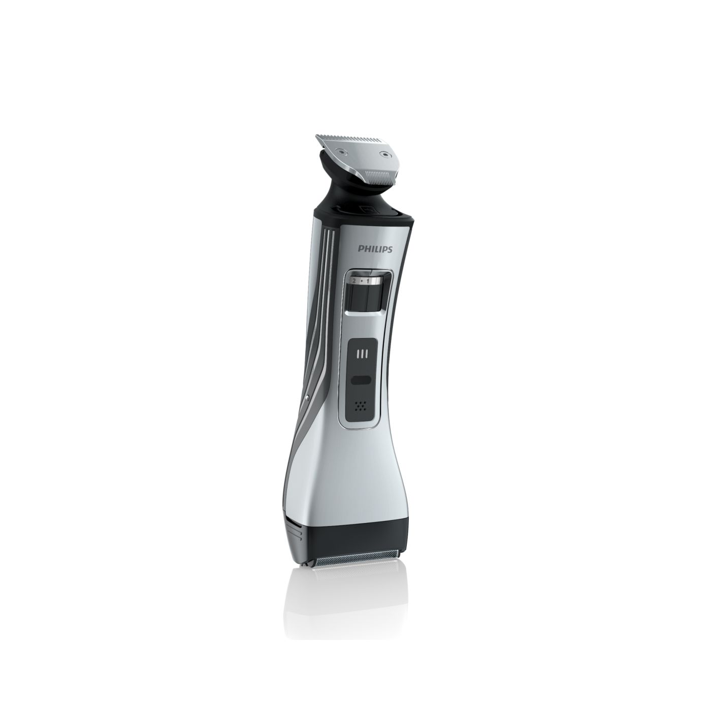 O aparador totalmente metálico (32 mm) e o pente com 12 ajustes de comprimento facilitam o barbear para que você possa obter exatamente o comprimento de barba desejado. Selecione o ajuste mais adequado usando o controle giratório. O aparador de metal resistente com bordas arredondadas garante uma aparagem precisa e uniforme.