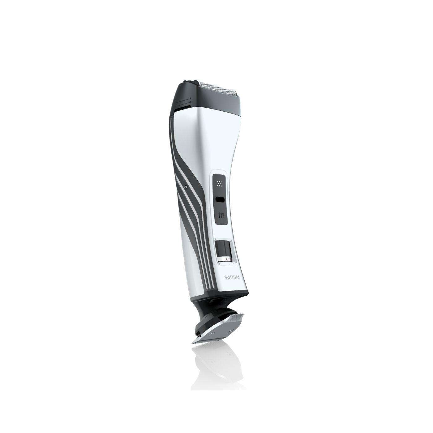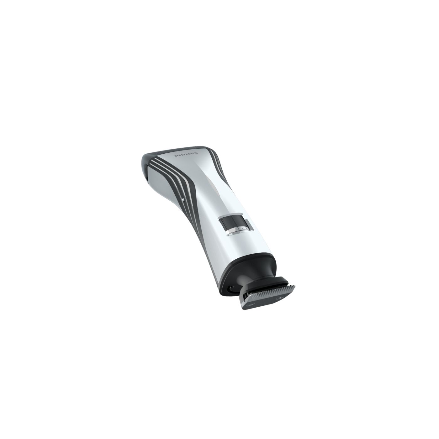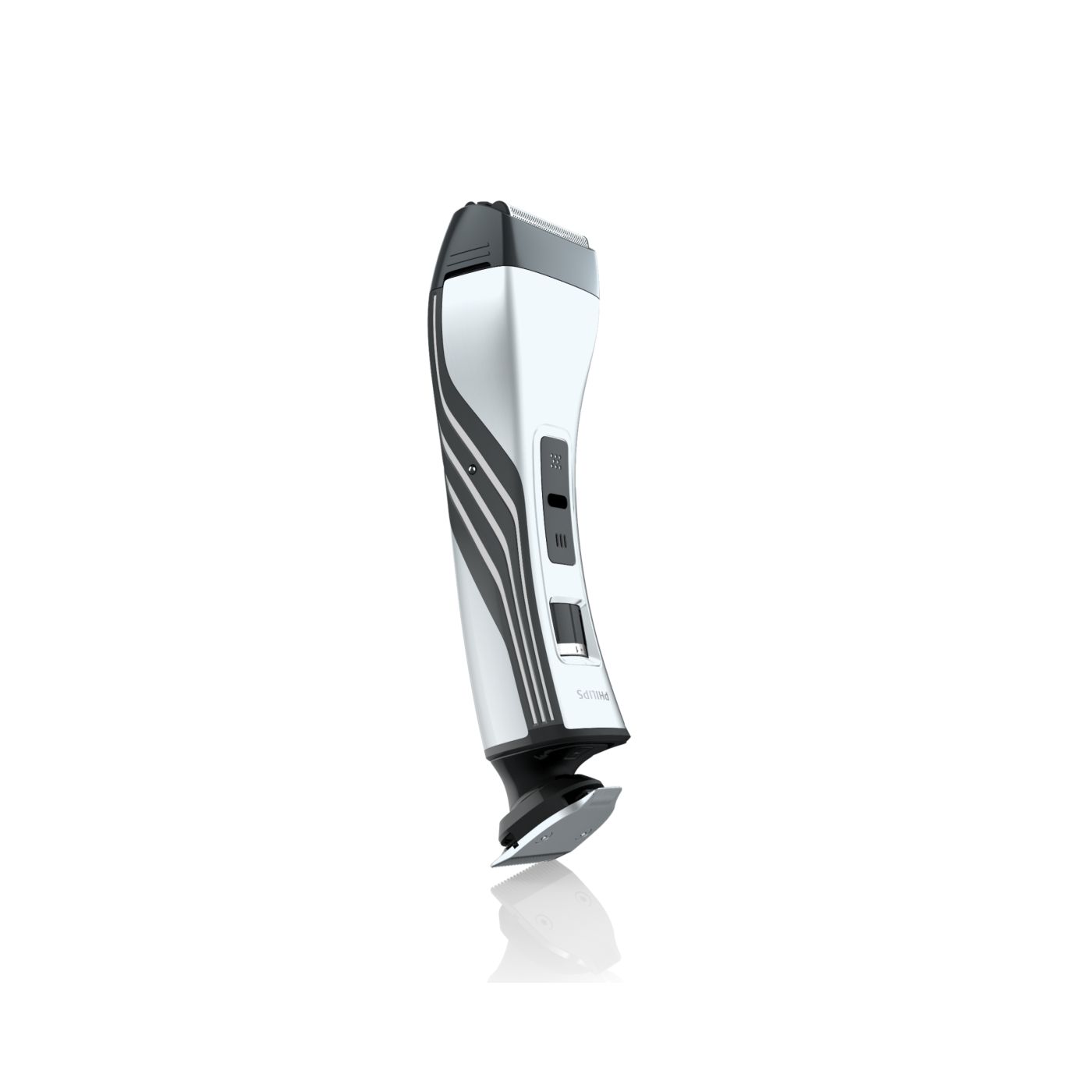 Ao remover o pente ajustável, você encontrará um aparador bilateral totalmente metálico na parte interna. Use o lado de 32 mm para obter uma aparagem mais eficaz e o lado de 15 mm para aparar com precisão os pequenos detalhes em áreas difíceis de alcançar. As extremidades arredondadas garantem contato suave com a pele. As afiadas lâminas de corte proporcionam aparagem rente à pele, ideal para pequenos detalhes ou áreas como a região do bigode e ao redor da boca.